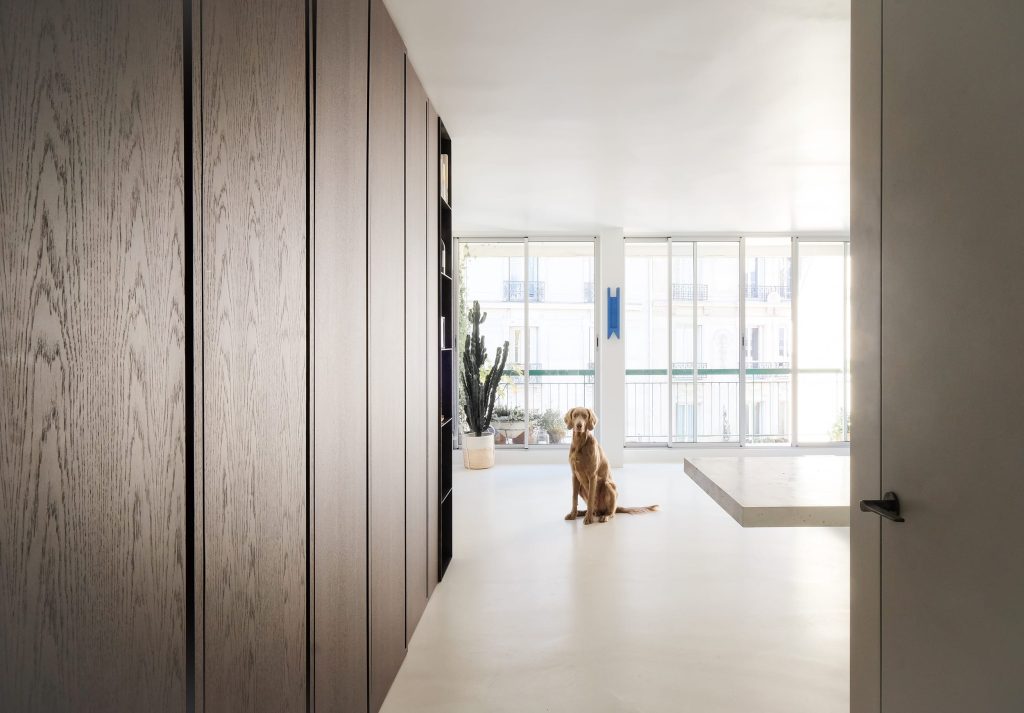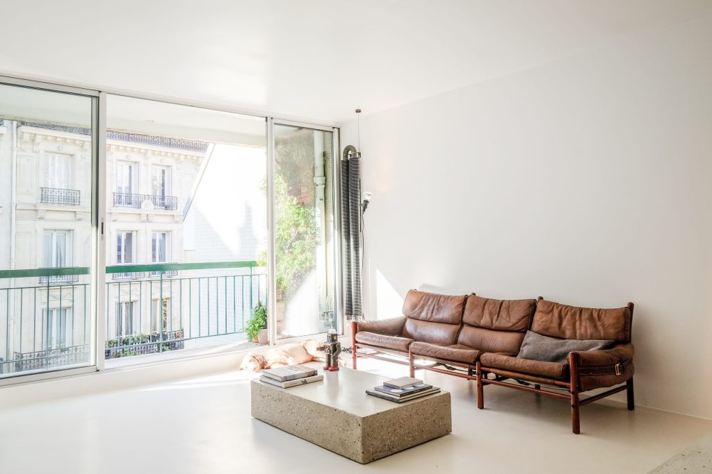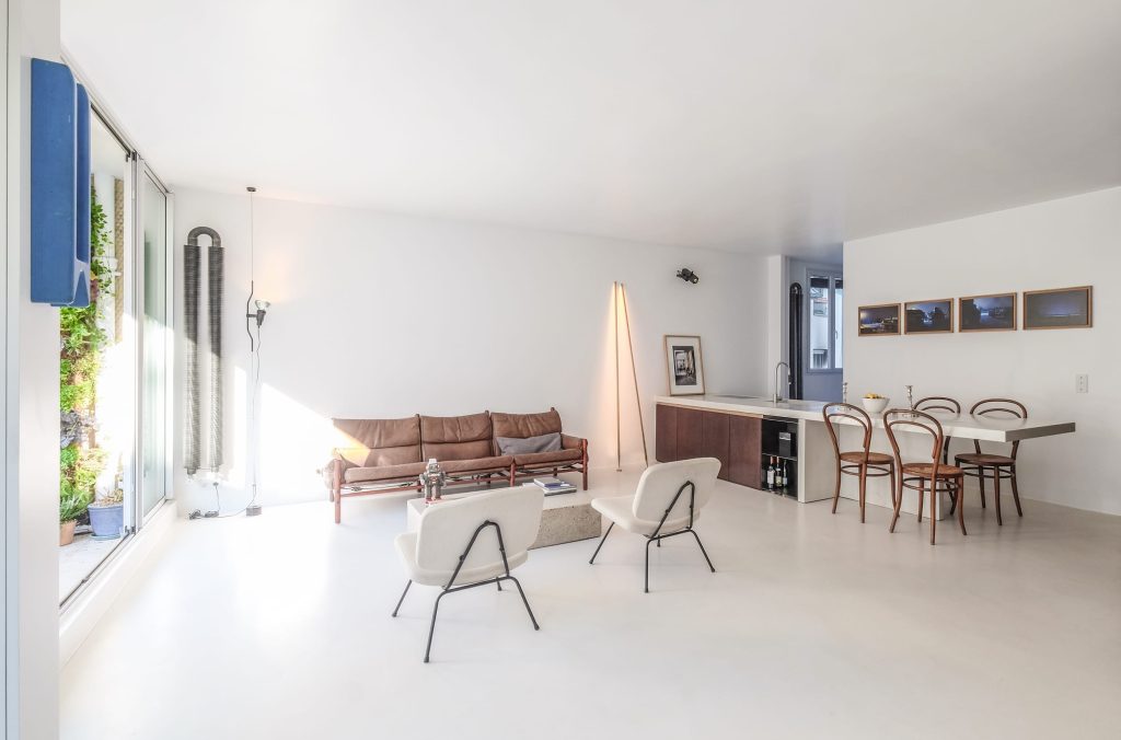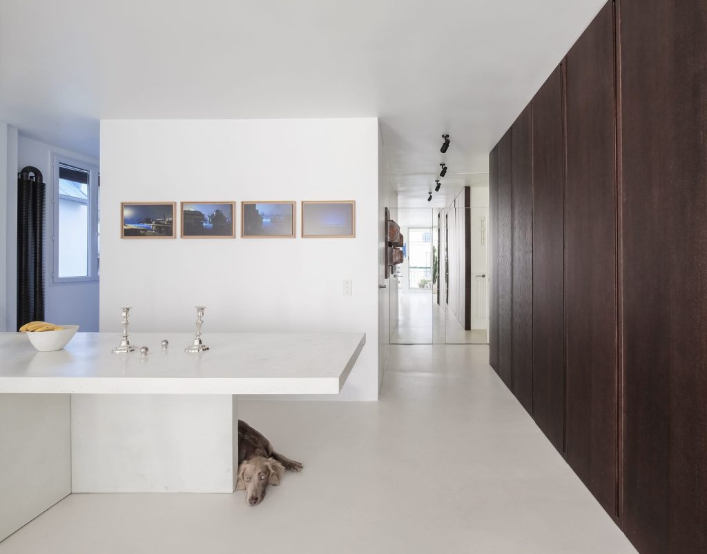 Cet appartement parisien dans un immeuble des années 80 a été complètement repensé et rénové par l’agence DAS-STUDIO. Les anciens chapes étaient démolie pour passage des réseaux. Après traitement technique à base de résine époxy, quartz et de trame, application dans toutes les pièces d’un WEBER FLOOR 4650 blanc cassé.