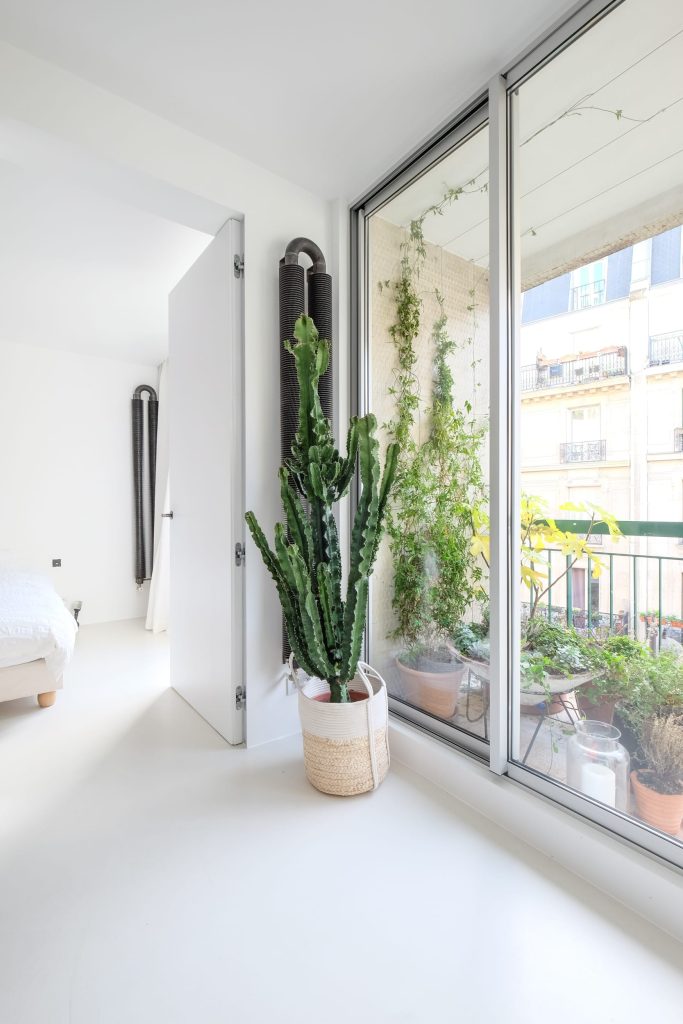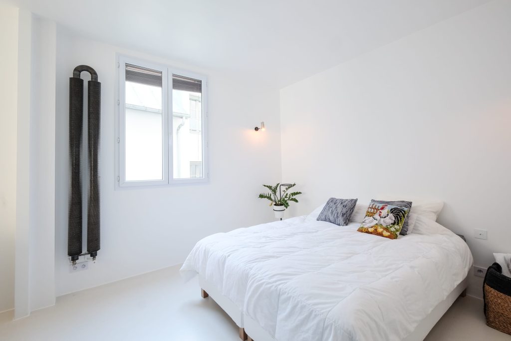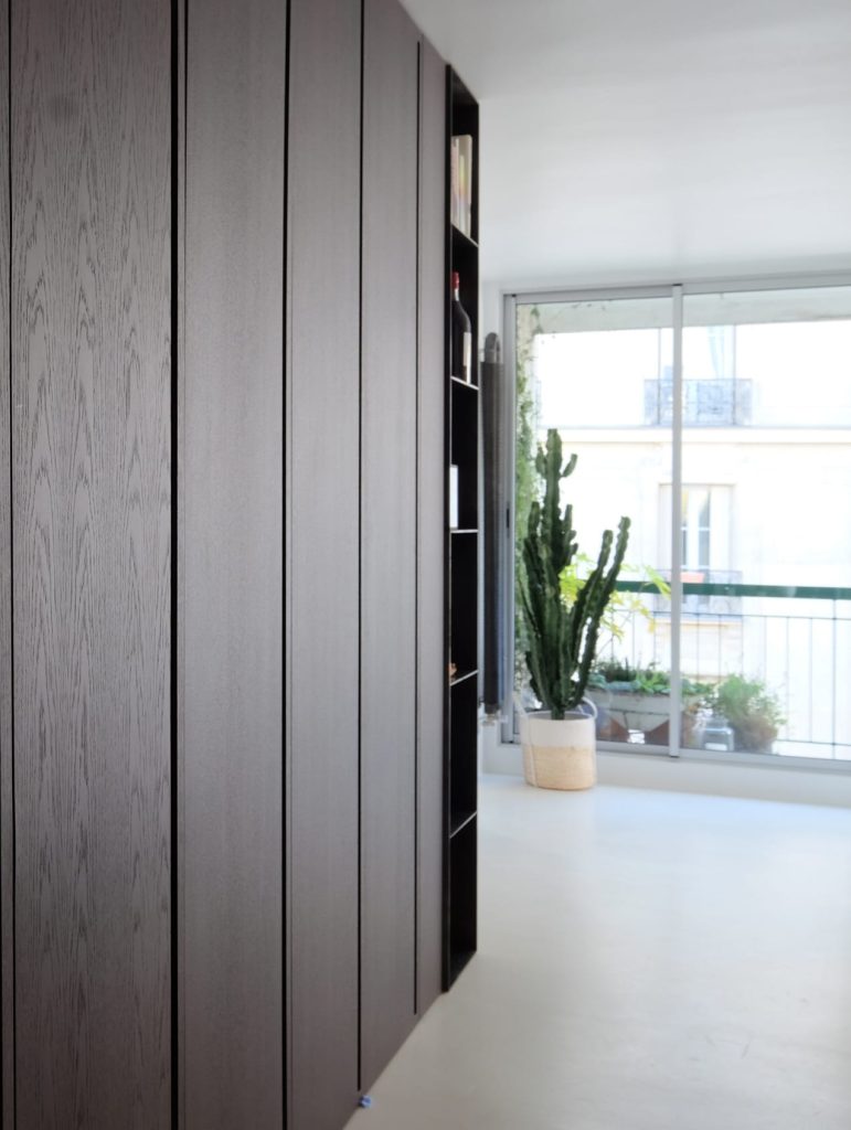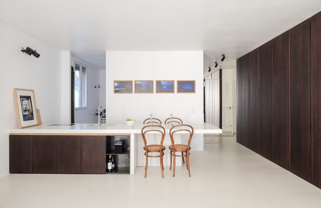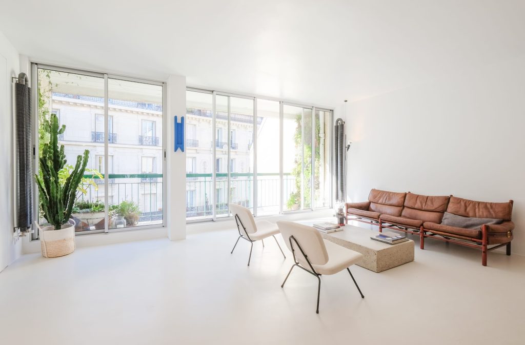 Cet appartement parisien dans un immeuble des années 80 a été complètement repensé et rénové par l’agence DAS-STUDIO. Les anciens chapes étaient démolie pour passage des réseaux. Après traitement technique à base de résine époxy, quartz et de trame, application dans toutes les pièces d’un WEBER FLOOR 4650 blanc cassé.